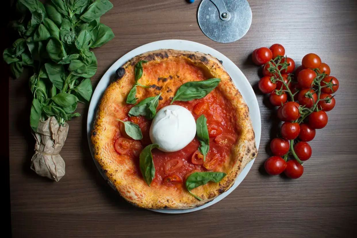 Passata di pomodorini, basilico, mozzarella di bufala D.O.C, formaggio, olio E.v.o