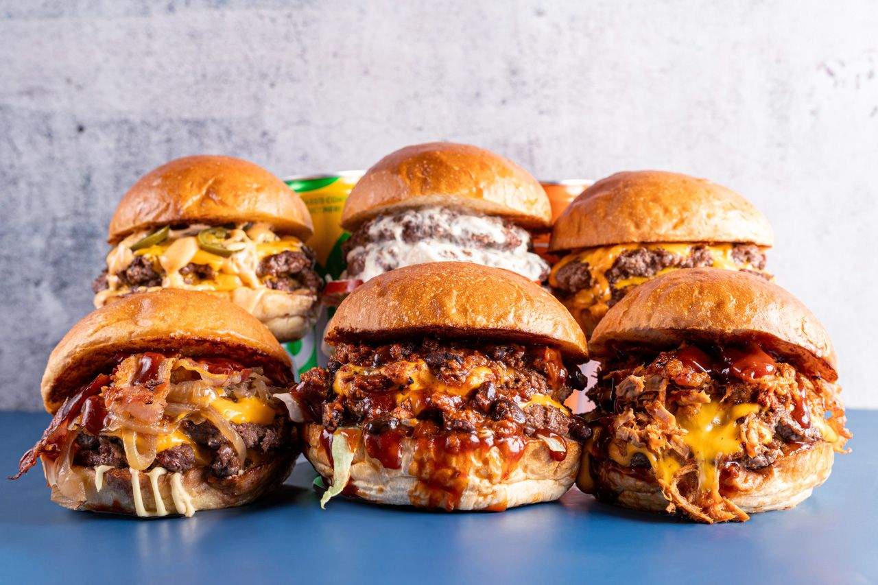 Due Hamburger Smashed (90 g ciascuno), doppio cheddar, doppio Cheddar, Doppio Bacon, Pulled Pork e Salsa BBQ