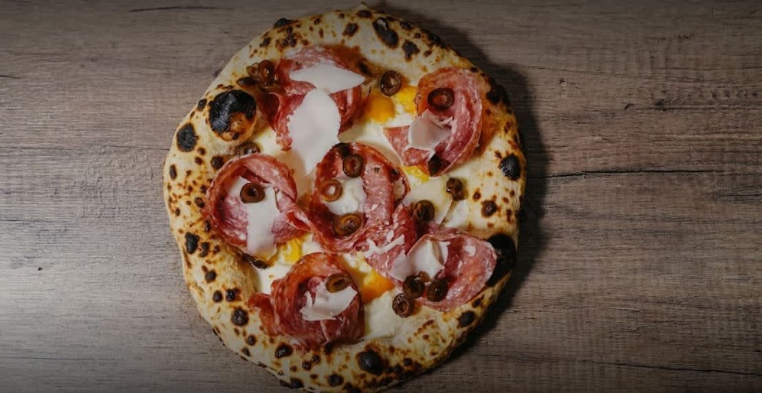 Pomodoro San Marzano, fior di latte Montrone, ventricina del Vastese, n'duja di Spilinga, terra di olive nere peperoncino in fili ,basilico, olio intenso Guglielmi