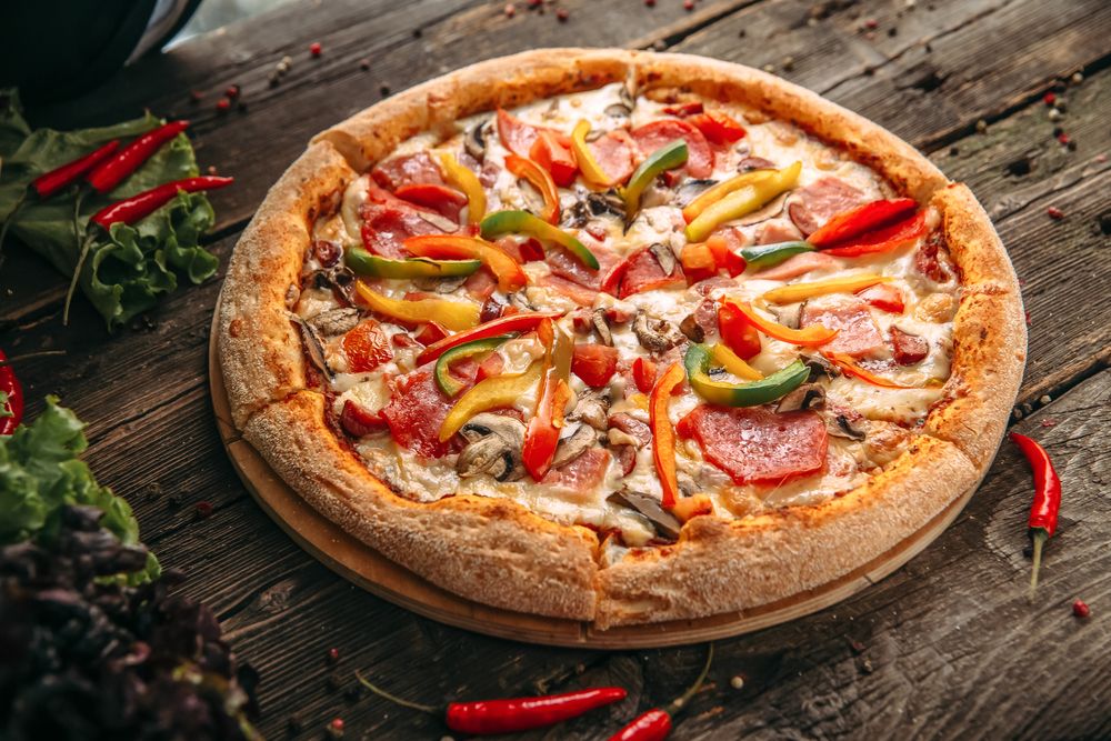 Pomodoro, mozzarella prociutto, salame, funghi, carciofi, olive