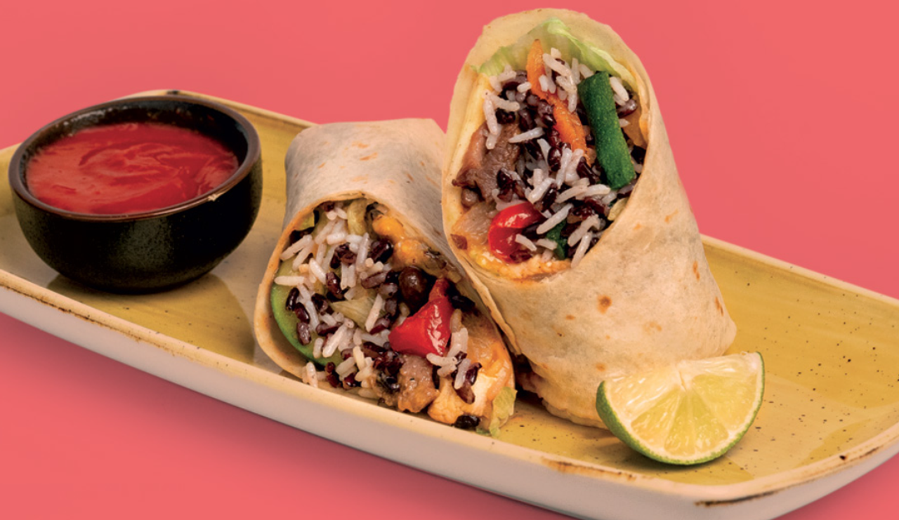 Pita greca arrotolata con carne di pollo, patatine, insalata verde, pomodoro, cipolla e salsa rosa.
