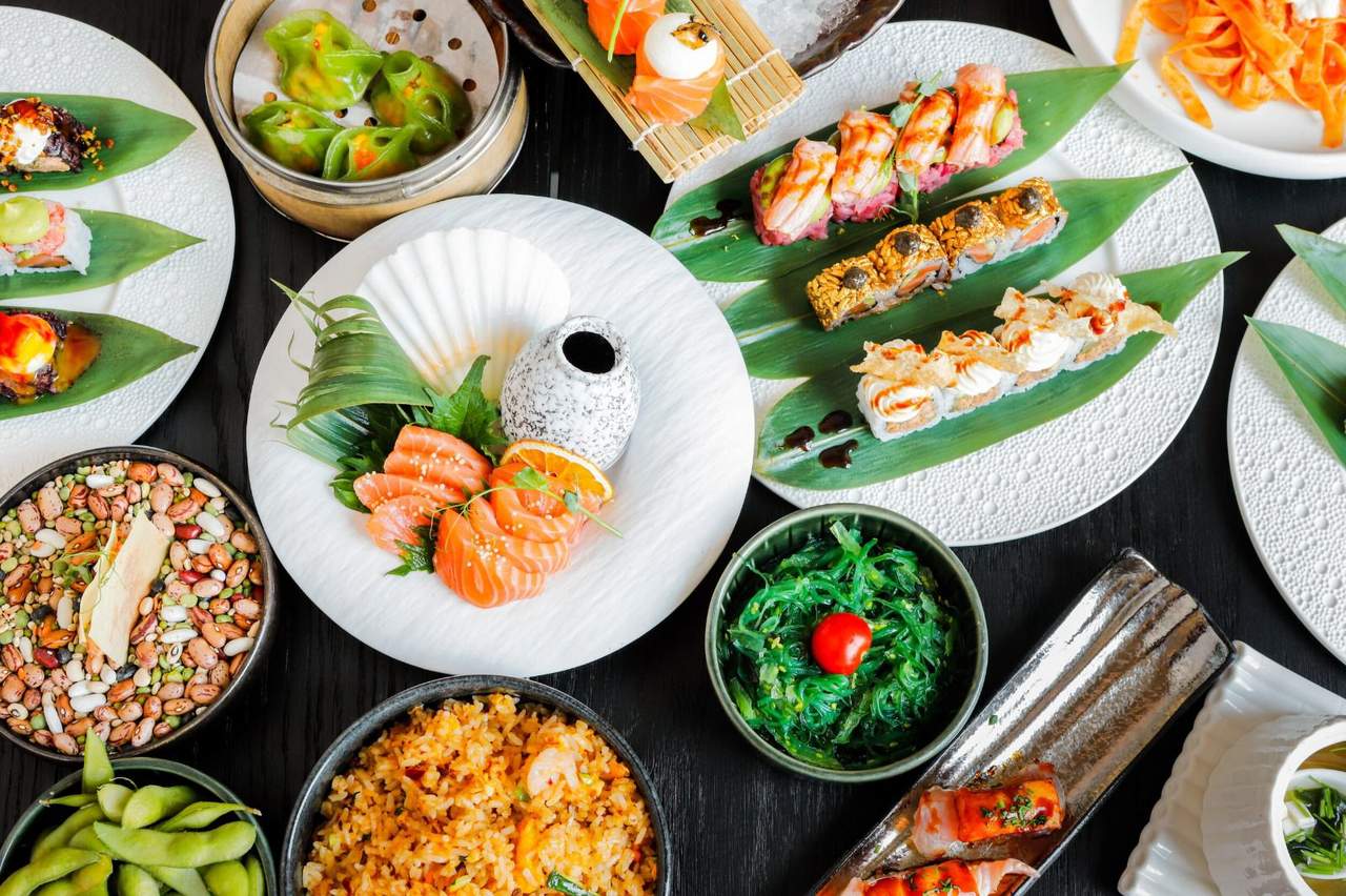 Doufu cinese, salsa spicy, lime ed erba cipollina, soia e latte, salmone scottato, gambero rosso, teriyaki