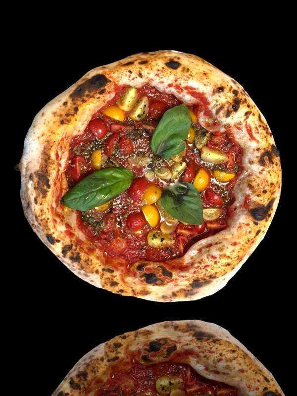 Passata di pomodoro, fior di latte, capperi, acciughe, olive nere, origano e olio EVO