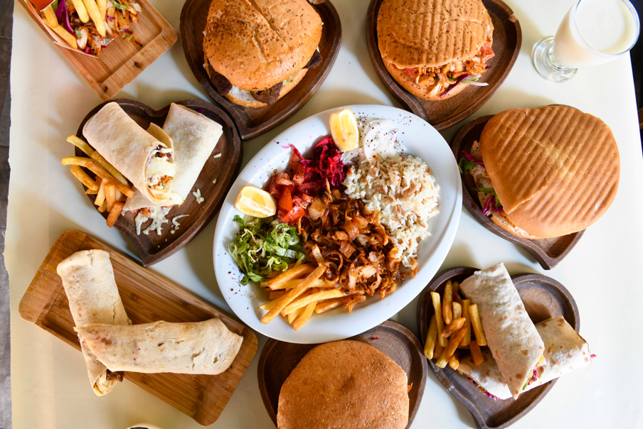 Carne di kebab, insalata, pomodoro, cipolle, salsa yogurt e piccante