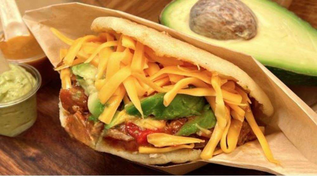 Focaccia di farina di mais ripiena con carne di manzo sfilacciata, platano fritto, fagioli neri e formaggio cheddar