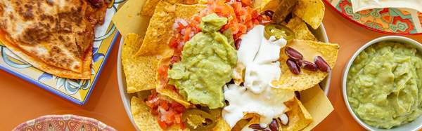 Cheddar fuso, guacamole, panna acida, pico de gallo, jalapenos e fagioli