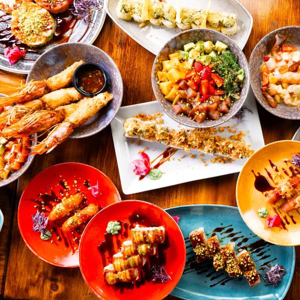 Alga nori, riso bianco, gambero in tempura crema di robiola, salmone, maionese giapponese, salsa teriyaki, pasta kataifi