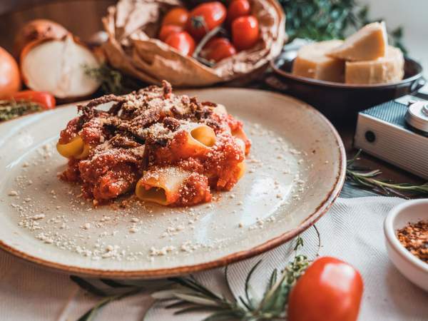 Sugo all'amatriciana con pancetta vegana (allergeni: glutine, sedano)
