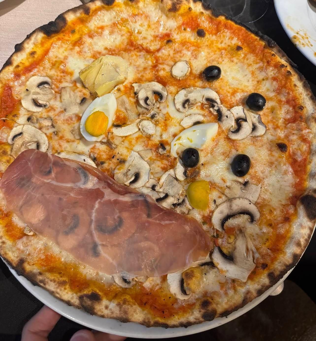 Uovo, pomodoro, mozzarella, prosciutto, carciofi, funghi, olive