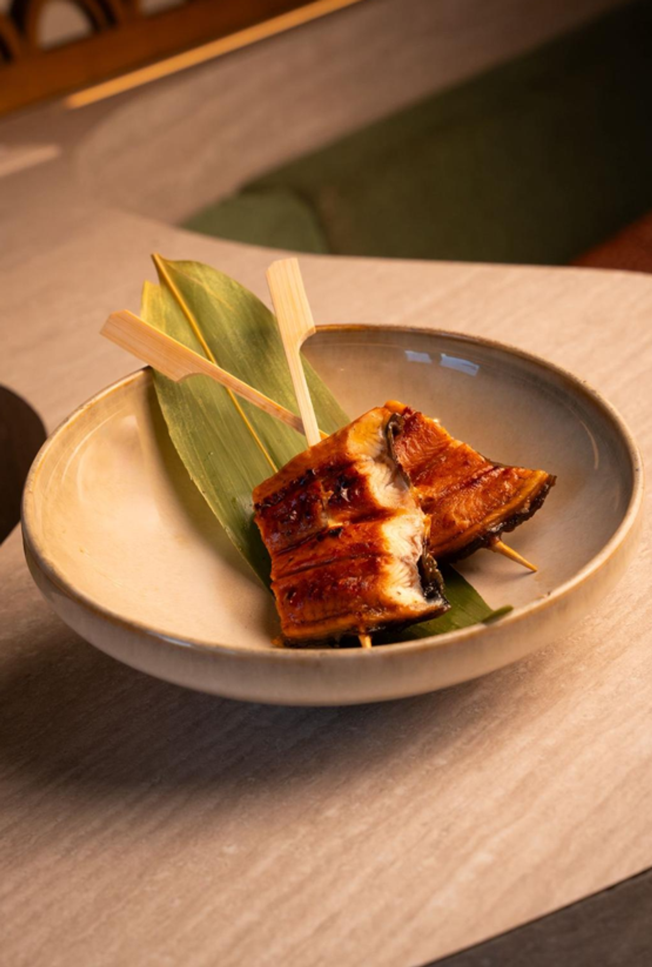 Ravioli di manzo wagyu grado a5 alla piastra con crosta tradizionale e salsa gyoza no tare 16, negima kushi-yaki, spiedini con cosce di pollo, porri e salsa sake