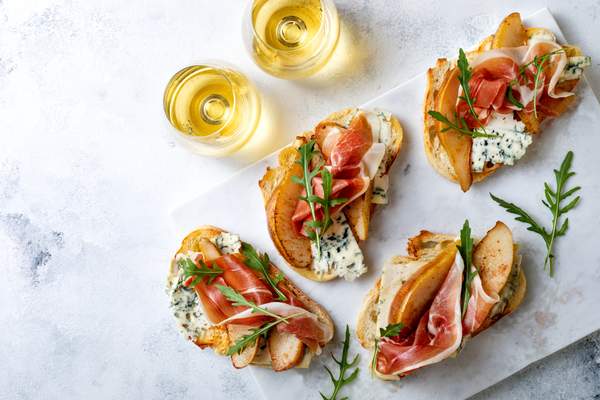 Prosciutto crudo di Norcia IGP, pecorino umbro, crema di olive, melanzane a filetti, rucola e olio extravergine di oliva