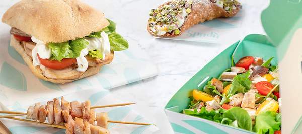 Ciabatta o focaccia semi integrale, trancio di pesce spada, rucola, scaglie di parmigiano D.O.P, pomodorini ciliegino gialli e rossi, crema di yogurt, salmoriglio