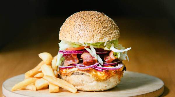 Pane, hamburger 130g, bacon, mix di formaggi, pomodoro, insalata iceberg, maionese, ketchup, pepe