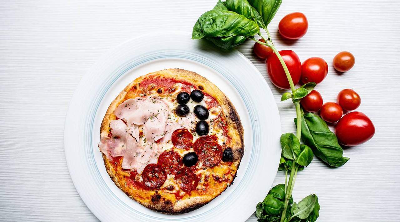 Pomodoro, mozzarella, prosciutto, olive, funghi e carciofini
