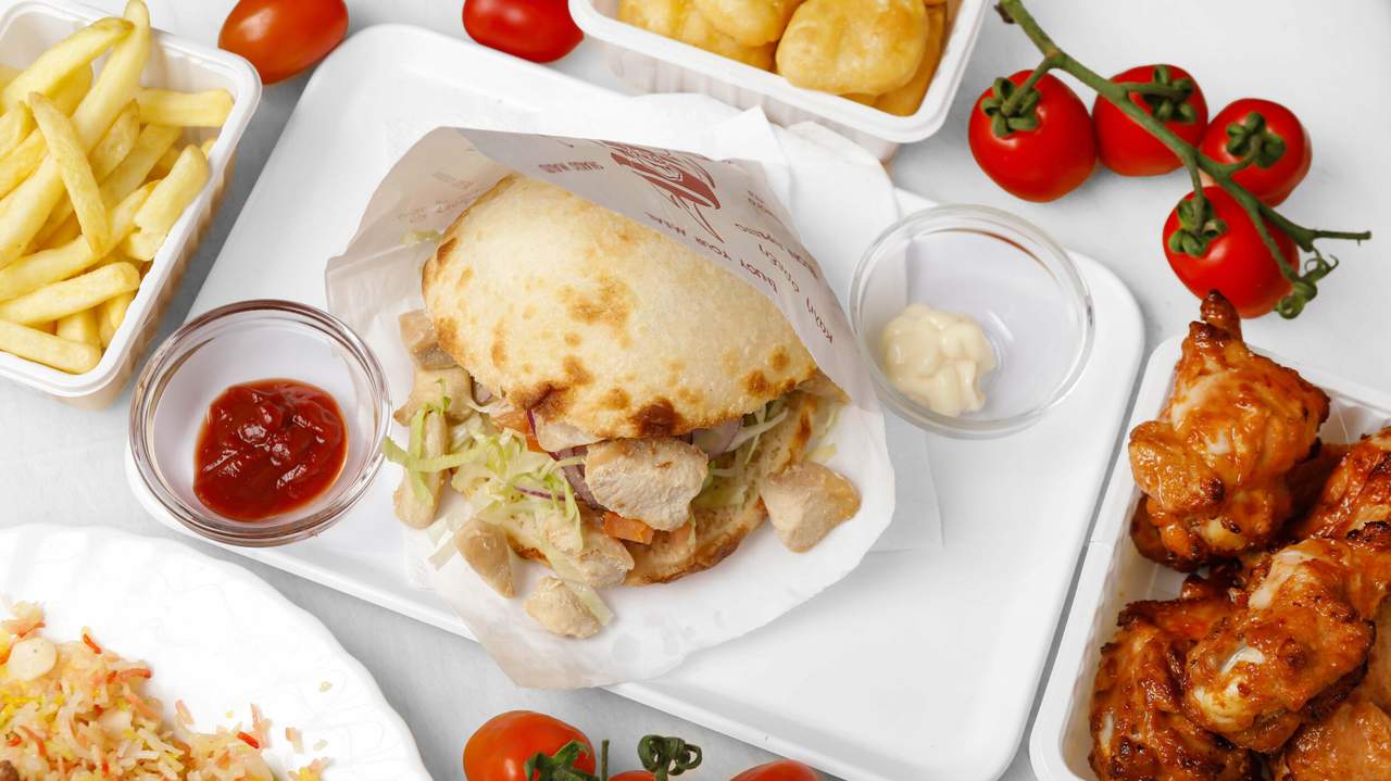 Pomodoro, mozzarella, insalata, cipolla, patatine fritte, carne kebab