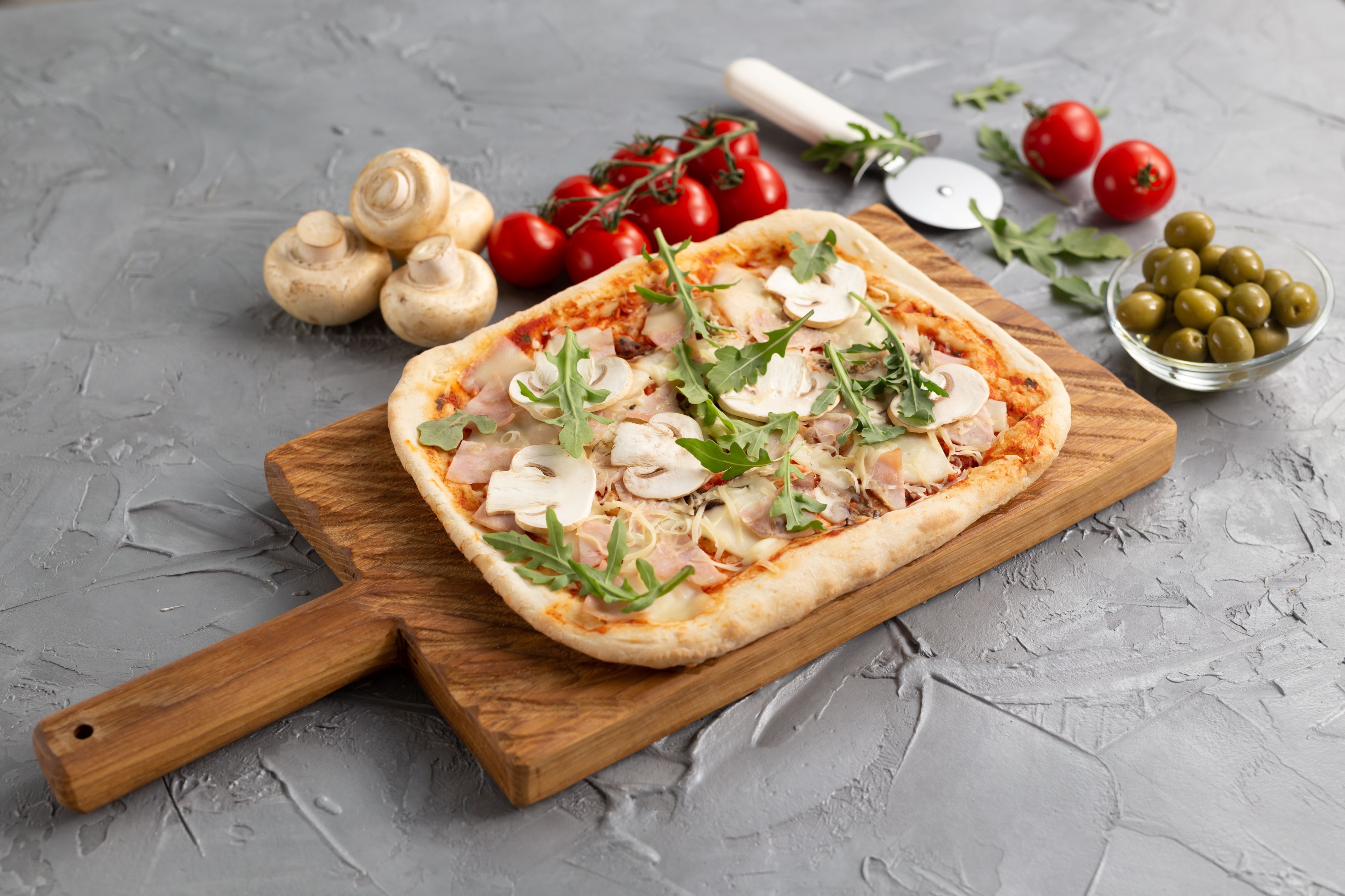 Pomodoro, mozzarella, prosciutto, funghi