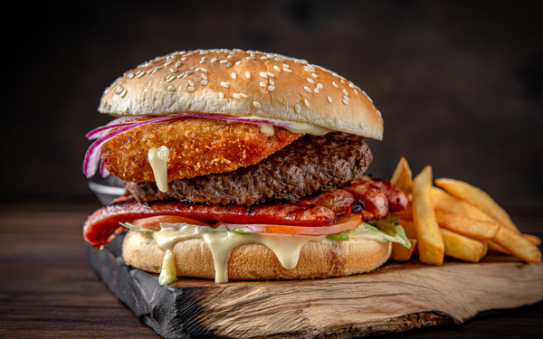 Hamburger di bovino 200g x 3, triplo cheddar, triplo bacon, doppia insalata, triplo pomodoro, due uova piastrate, maionese, salsa piccante