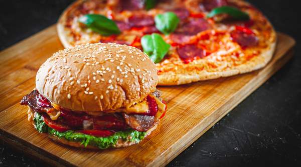 Hamburger 150 g, jalapeno ripieni di formaggio fritti, onion rings, salsa 'nduja, uovo, emmental, cheddar, bacon, lattuga, pomodoro, maionese e patatine fritte classiche