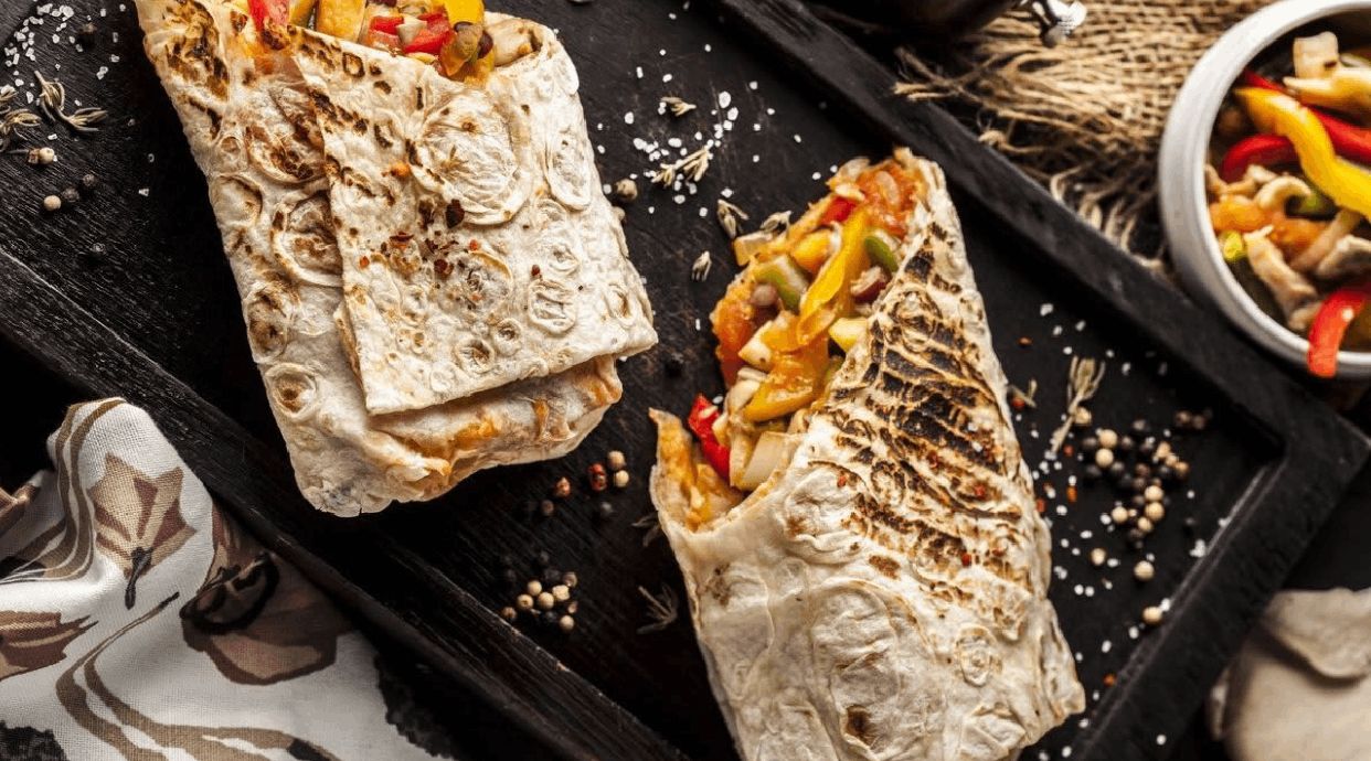 Лаваш 100гр,фри 110гр,огурец 15гр,белый соус 65гр,красный соус 55гр,мясо 120гр