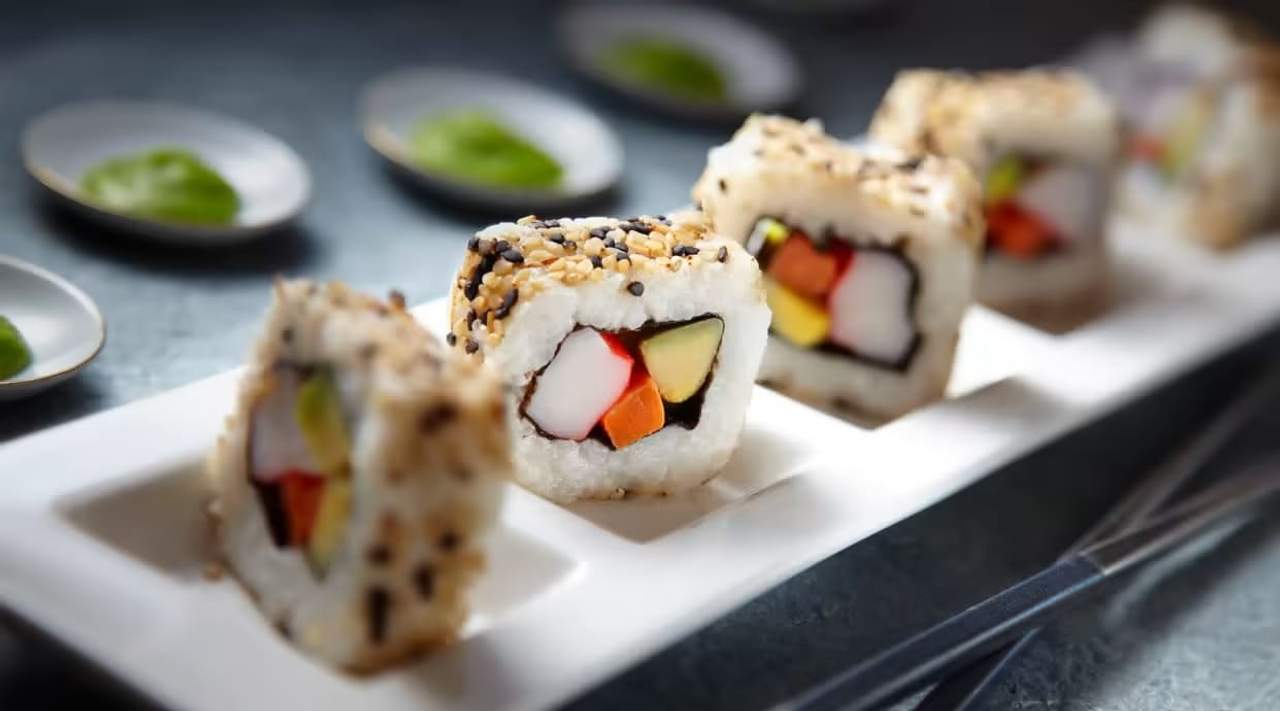 Rouleau de riz avec crevette panée, entouré d’algue nori