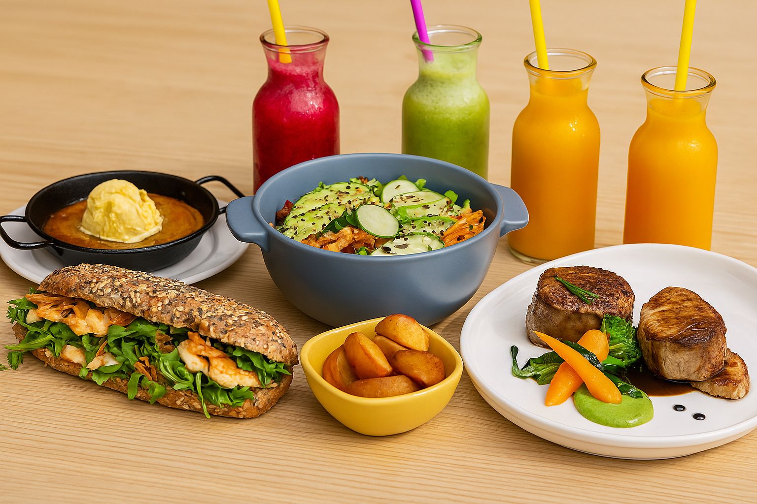 Pain noir aux céréales et graines, poulet grillé, gambas, parmesan, oignon caramélise et crispy, tomates confite, roquette. Servi avec potatoes McCain