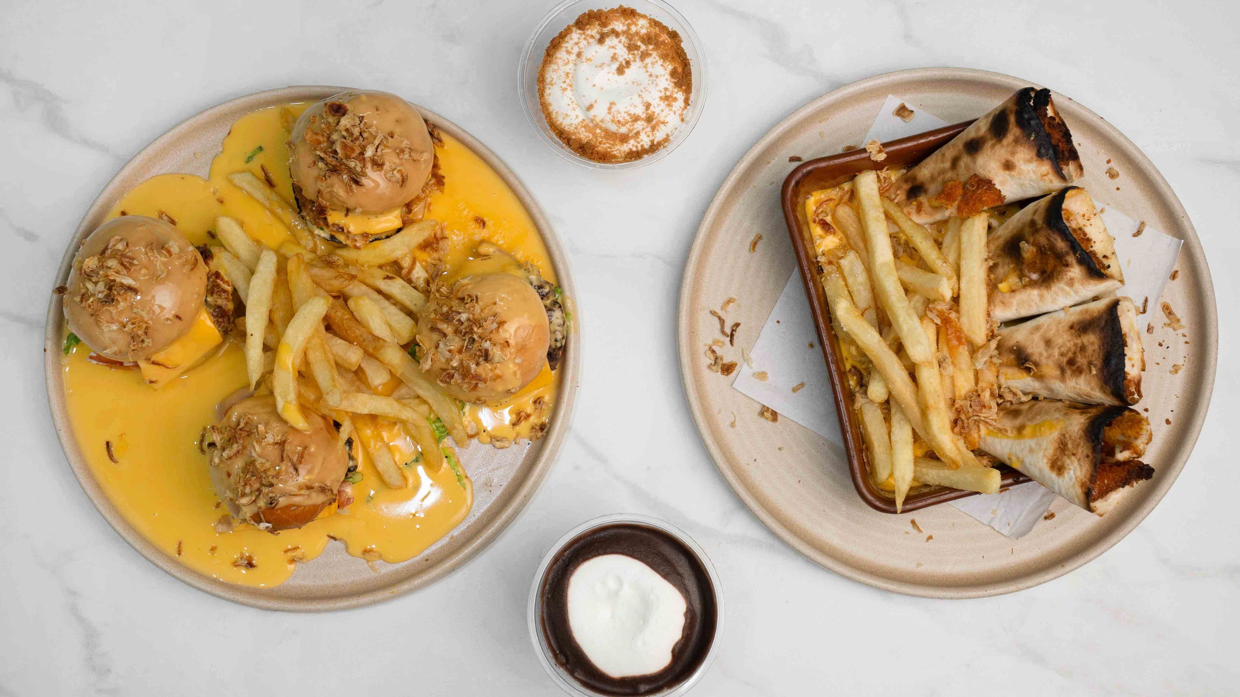 Frites, sauce béchamel, crème fraiche, mozarella, poulet, viande hachée