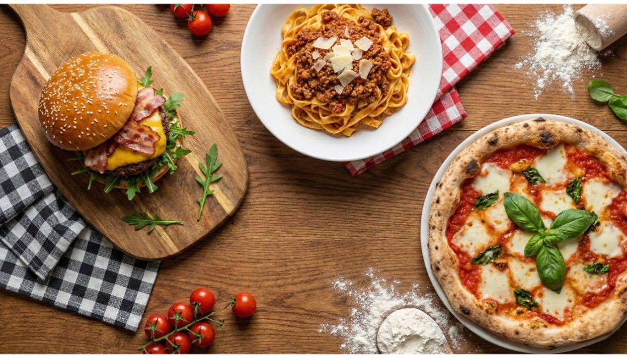 Bun, viande hachée, poulet crispy, iceberg, tomate, oignon crispy, cornichon, cheddar, sauce maison