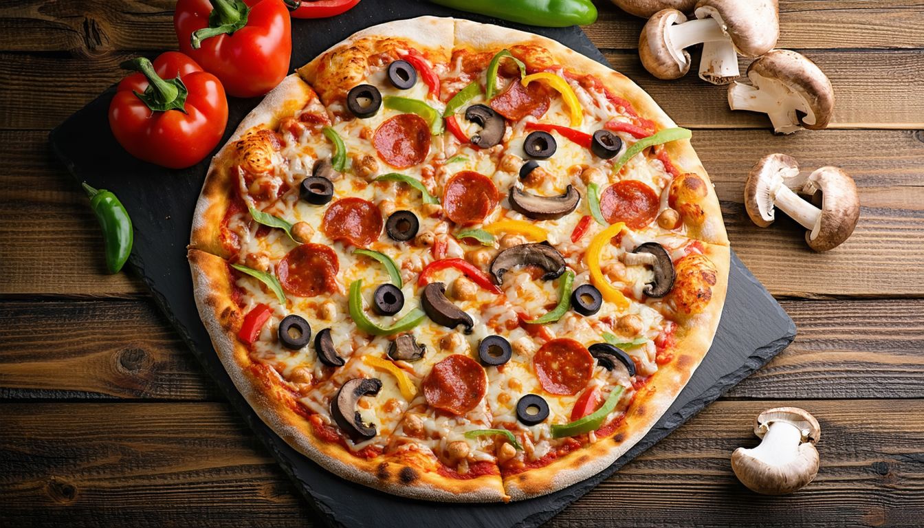 Sauce Tomate, Mozzarella, Poulet, Viande Hachée, Thon, Jambon de Dinde, Pepperoni, Olives Noires, Origan