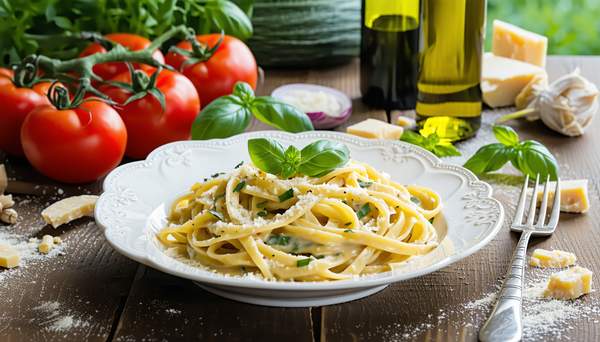 Jambon fumé, jaune d'œuf, sauce blanche, parmesan, basilic, servis sur spaghetti ou tagliatelle