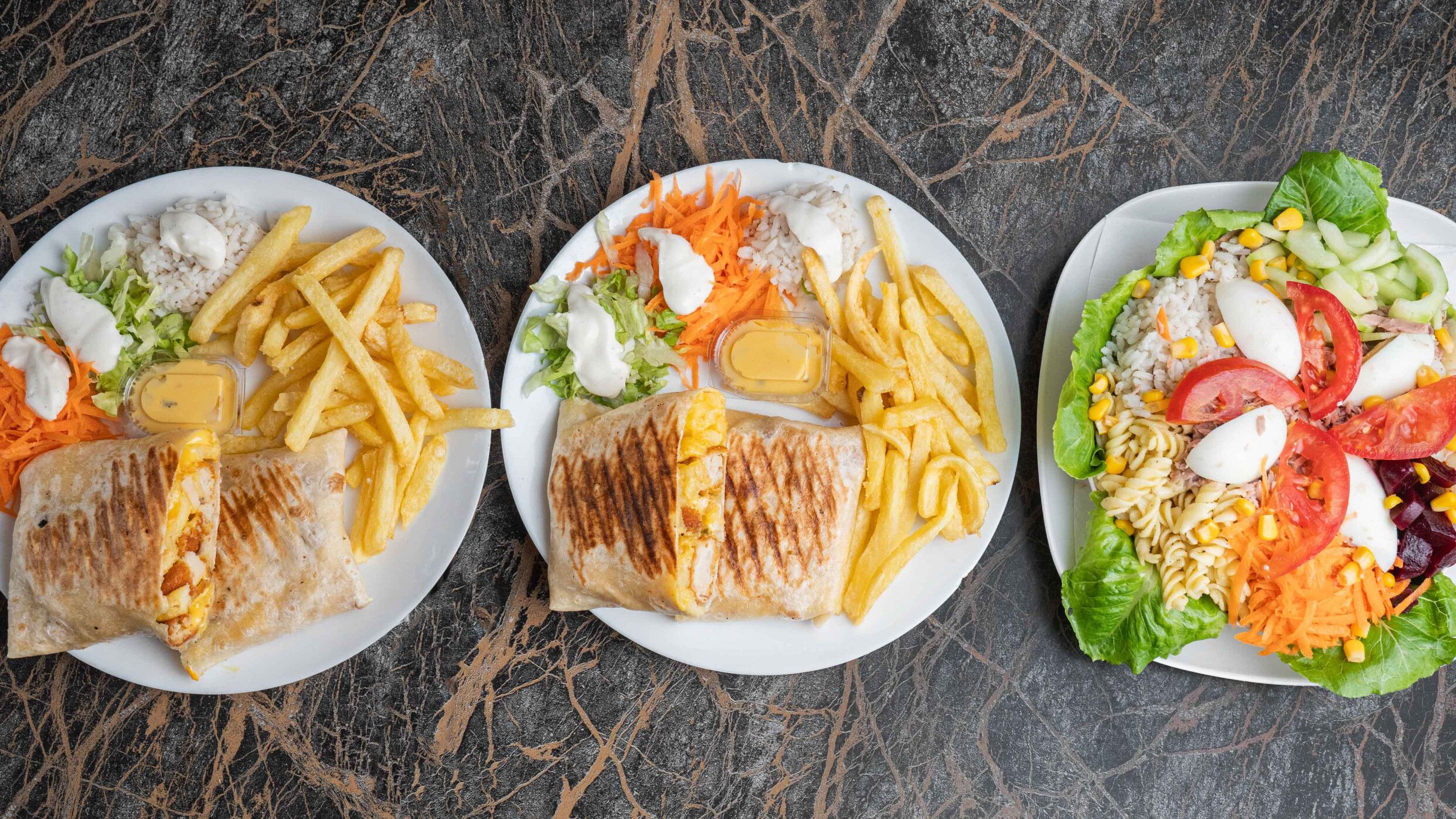 Poulet, viande hachée,chicken crispy,jambon de dinde ,pain tortilla,frites,sauce,fromage.
