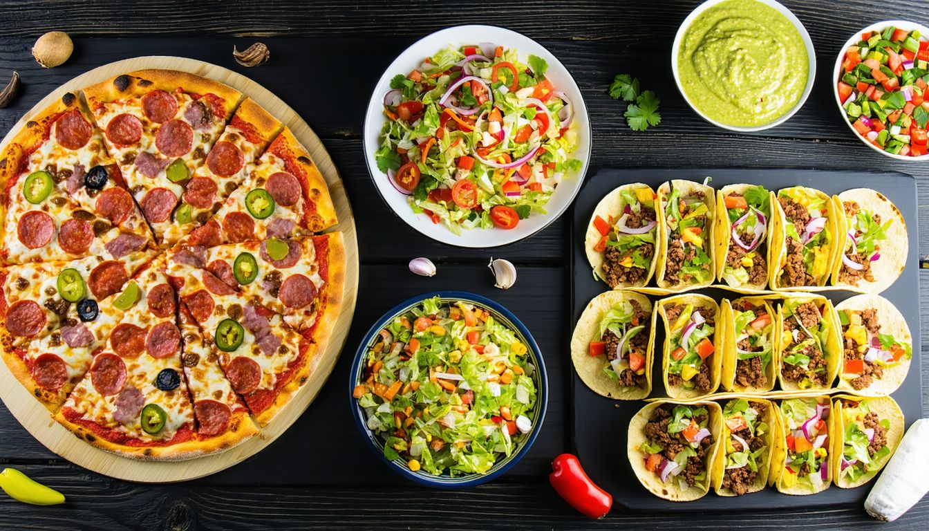 Viande épicée, double portion de fromage, légumes, sauce