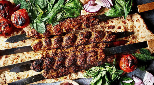 Plat Machawi mixte: 1brochettes kebab halabi,1 brochettes kebab khechkhach,2 brochettes chich tawook, Arayes, tomates, oingon, cornichons, mayonnaise, avec frites