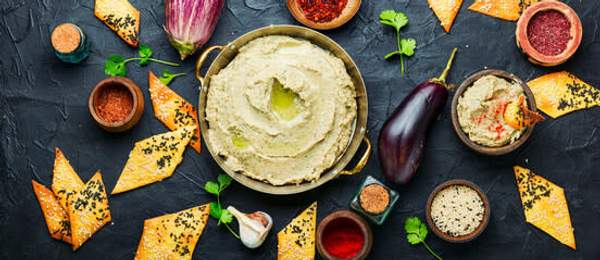 Baba ghanouj, moutabal, 2pcs falafel, mhamara, mezzeh houmous, kebbeh