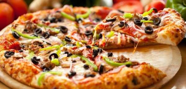 Patte Pizza Maison Sauce tomate Maison Viande Hachée Champignons Poivrons Rouge, vert et Jaune Olives Noires Mozzarella
