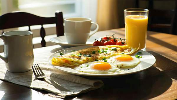 2 oeufs plat ou omlette, fromage, mortadella, boisson chaude au choix, mini jus d'orange