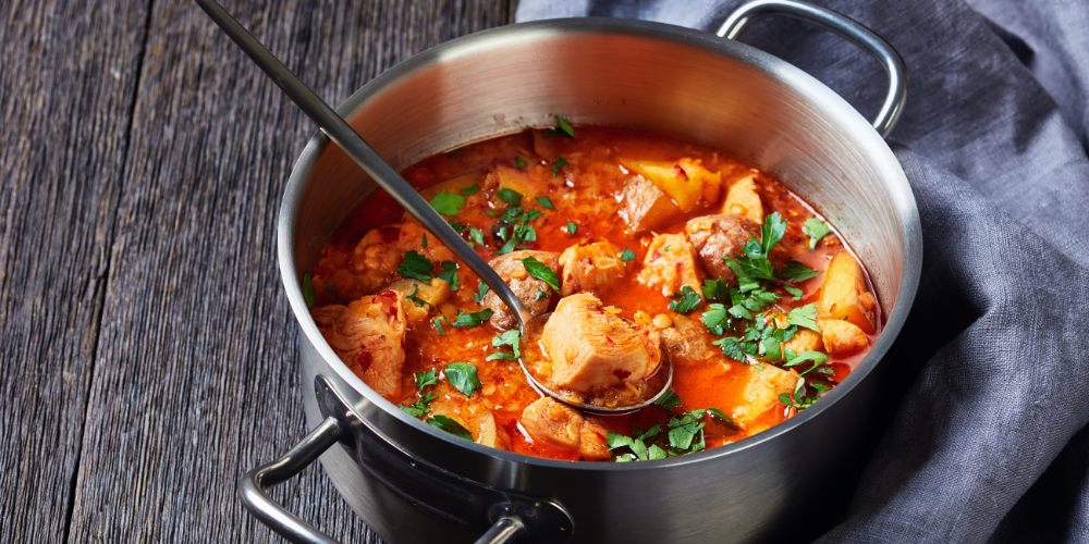 Tradicionalni juneći gulaš, dinstani crni luk, paradajz sos