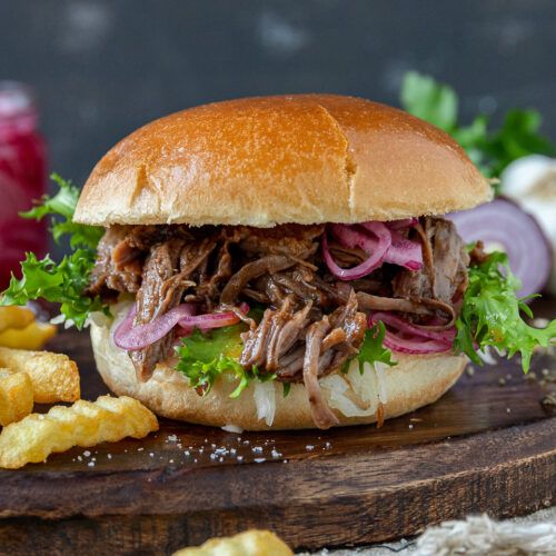Rebarce u BBQ sosu, karamelizovani luk, sir, pomfrit.
