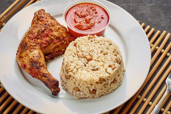 Delicious spicy basmati rice with juicy diced goat meat, plantain, and a refreshing drink.