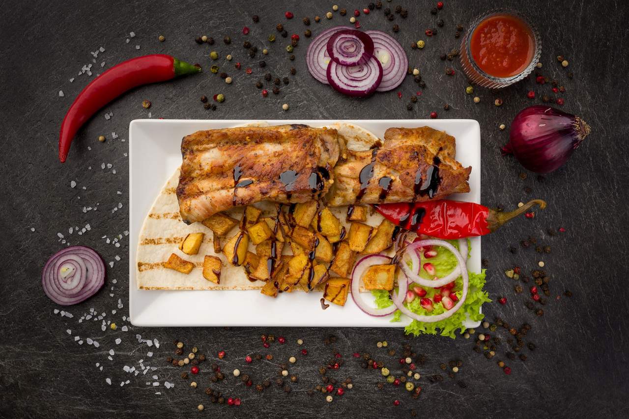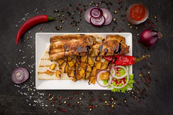 Karkówka 250g, ziemniaki 150g, cebula, granat, sos adżika (pomidor, czosnek, papryczka chili, przyprawy)