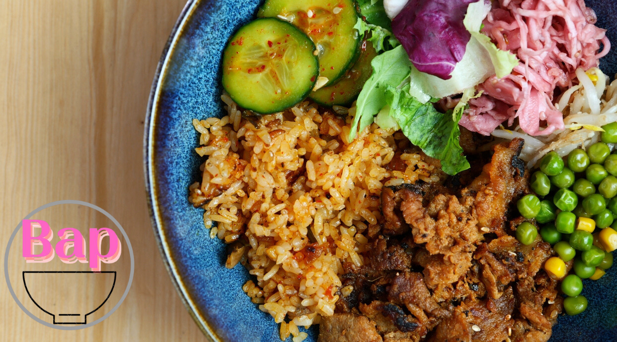 wołowina w koreańskim stylu bulgogi, do wyboru czarny ryż (biały ryż z ziarenkami czarnego ryżu), ryż smażony z kimchi, japchae (makaron z batatów), do wyboru jeden z siedmiu sosów, banchan (zestaw warzyw: sałata, surówka sezamowa, marynowane kiełki fasoli mung, ogórek w marynacie kimchi, marynowany groszek)