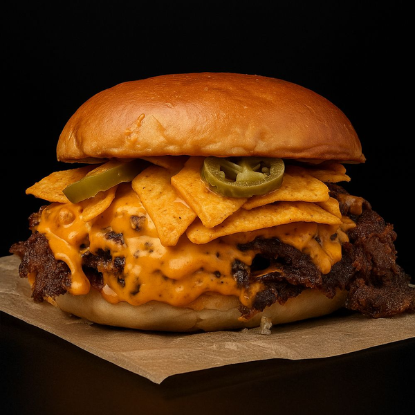 Bułka Brioche, sos Spicy mayo, sos serowy cheddar, nachosy, 2x kotlet smash (100% wolowina), 2x mimolette, czerwona cebula, pikle, jalapeno, sałatka, salsa meksykańska