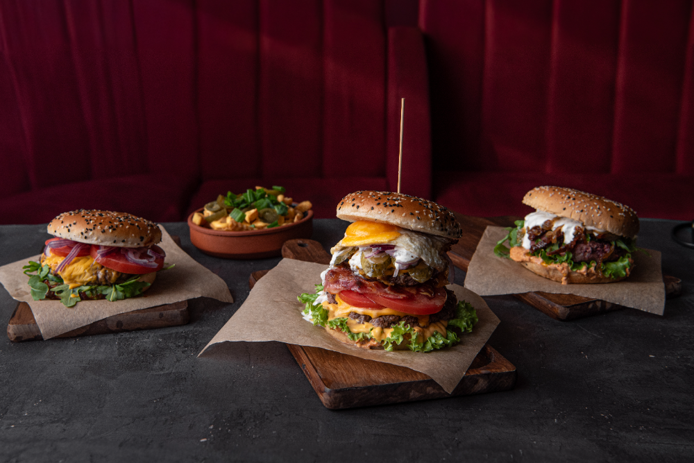 Bułka brioche, 2 kotlety wołowe, podwójny cheddar, bekon, jajko sadzone, czerwona cebula, liść sałaty, pomidor, pikle. Sosy: Cheddar Hustle + Silent Garlic.