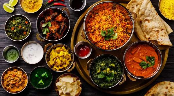 jagnięcina, krewetka i mieszanka warzyw, kurczak bez kości z prażoną cebulą, orzechami nerkowca i północnymi przyprawami indyjskimi z ryżem basmati