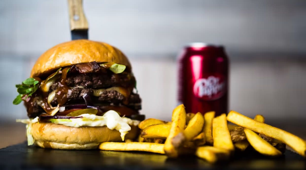 ogórek konserwowy, sałata, 2 x wołowina smash, cebula, cheddar, boczek, sos firmowy, bbq