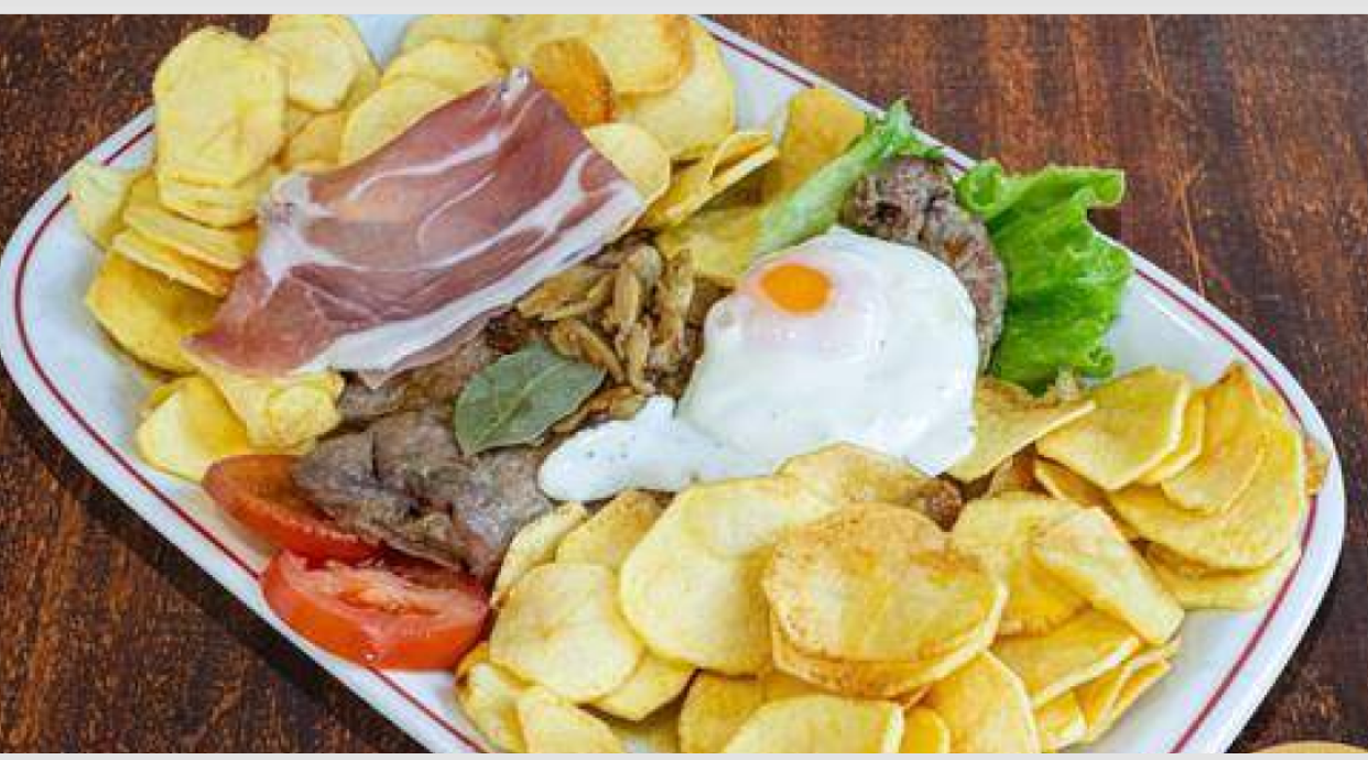 Bife da vazia 300gr, acompanha com batata frita à rodela, presunto e ovo estrelado