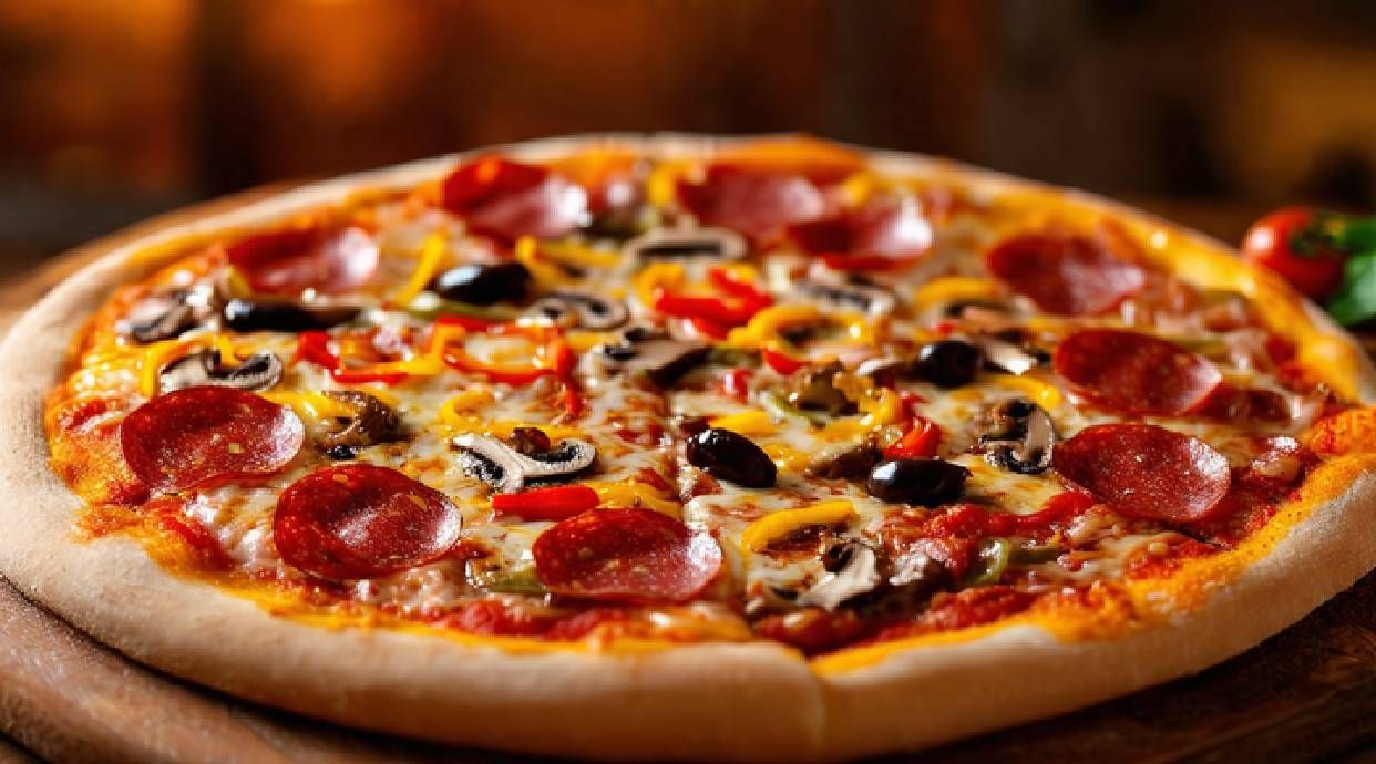 Molho de tomate, queijo mozzarella, molho picante, bacon, fiambre, azeitonas e uma bebida 330ML