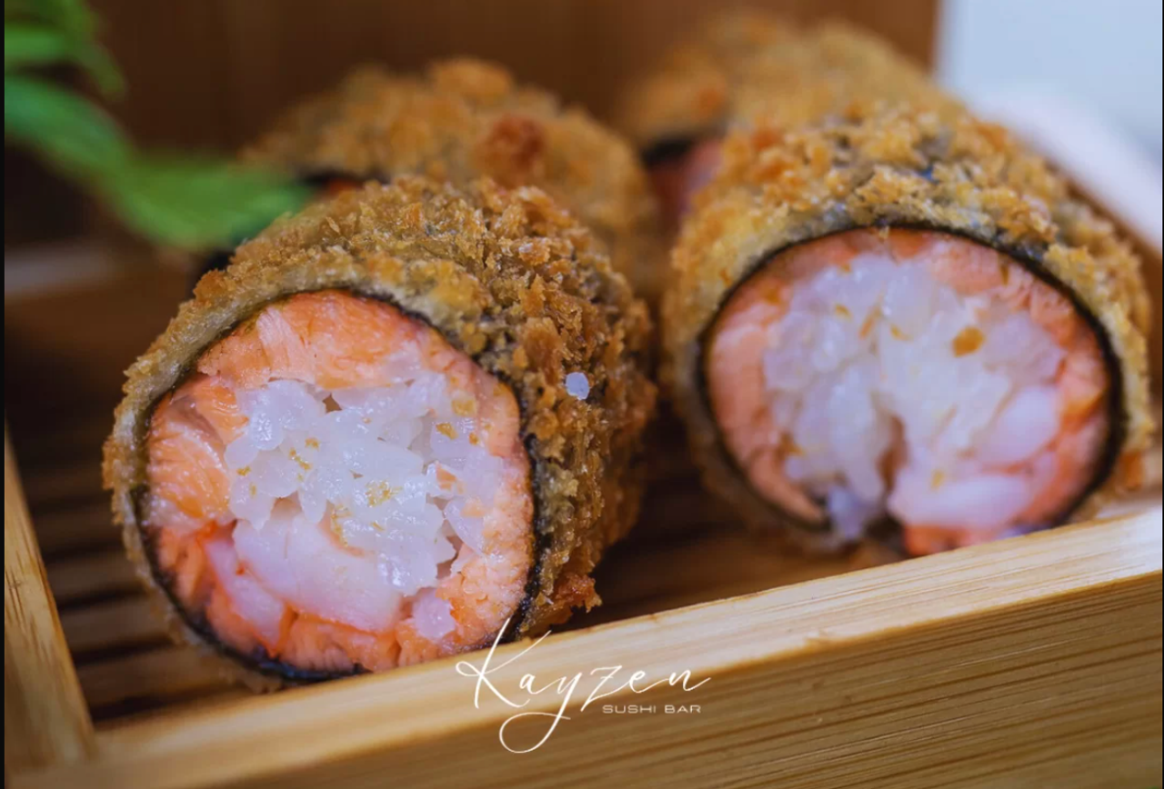 Salmão batido com queijo philadelfia , camarão em tempura envolvido em uma folha dê Tamago.