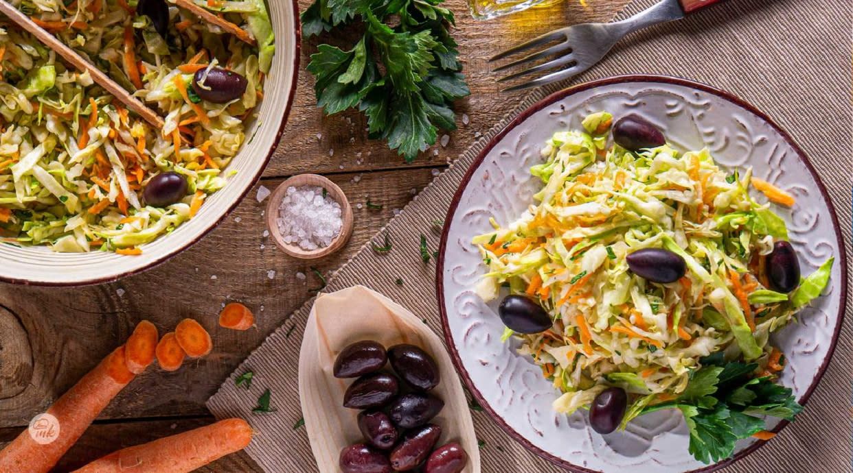 Arroz em calda de tomate, frango aos pedaços, chouriço, repolho e salada (alface, tomate, pepino e cenoura).