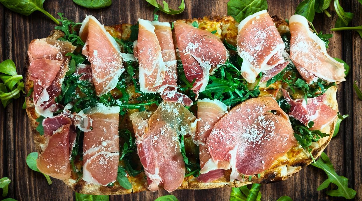 Size 30x25cm. Molho de tomate, queijo mozzarela, speck (tipo de presunto) e rúcula.