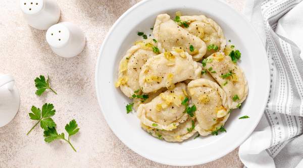 Bolinhos de massa cozida recheados com puré de batata, servidos com cebola dourada salteada.